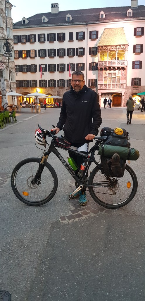 Am 18. Mai 2023 startete ich von Meran Richtung Jaufenpass mit einem älteren Mountainbike, welches ich für 200€ kurz zuvor gebraucht erworben hatte. Darauf gepackt ein Zelt, ein Schlafsack, Regenschutz und Proviant für 2 Tage. Mein imaginäres Ziel der Reise war das Nordkap, der nördlichste Punkt Europas. Aber an diesem ersten Tag war ich überhaupt nicht sicher ob ich dieses Ziel je erreichen werde. Inzwischen war das Ziel für Tag eins Innsbruck. Da hatte ich mir zu Anfang gleich eine der anstrengendsten Etappen ausgesucht mit 2.620 Höhenmeter und 110km. Nach knapp neun Stunden erreichte ich völlig erschöpft Innsbruck, wo ich in der Studentenbude meines Sohnes übernachten durfte.