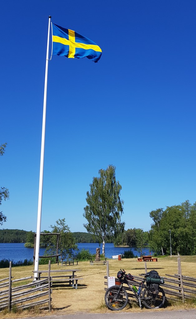 Am Tag 19 erreichte ich endlich Schweden. Bemerkenswert an diesem Punkt war, dass ich inzwischen durch Österreich, Tschechien, Deutschland und Dänemark gefahren bin, aber immer noch mehr als die Hälfte des Weges vor mir hatte. Nur die vor mir liegende Strecke durch Schweden war länger als die bisher zurückgelegte Strecke durch die vier Staaten. In Schweden wurden erste Veränderungen der Vegetation sichtbar. In diesen typischen schwedischen Hügellandschaften wurden die Wälder immer lichter. Meine typische Mittagspause war ein Brot mit Aufschnitt, insofern ich irgendwo eine Bank auf dem Weg fand. In Schweden fuhr ich immer auf Nebenstraßen, welche meist fast ohne jeglichen Autoverkehr waren. Da Skandinavien relativ dünn besiedelt ist, musste ich meine Tagesplanungen nach den nächsten Supermarkt ausrichten.