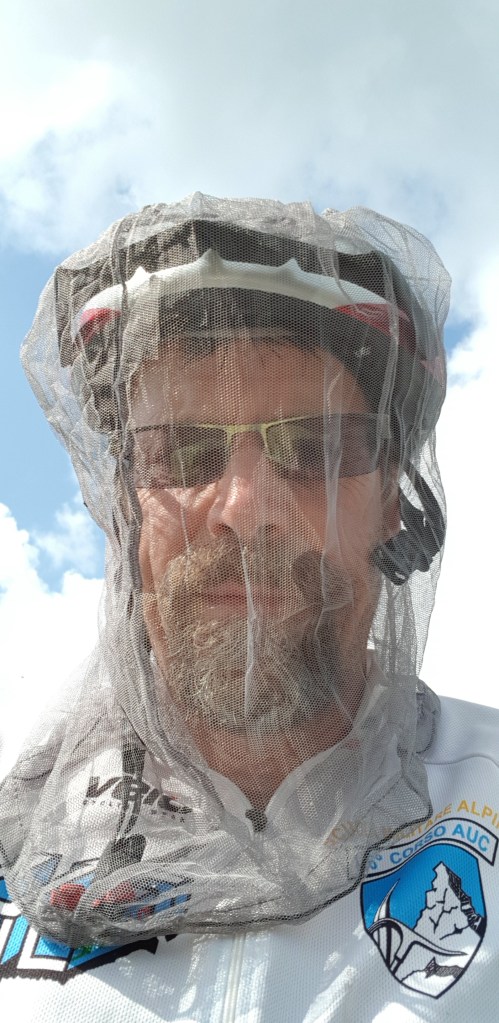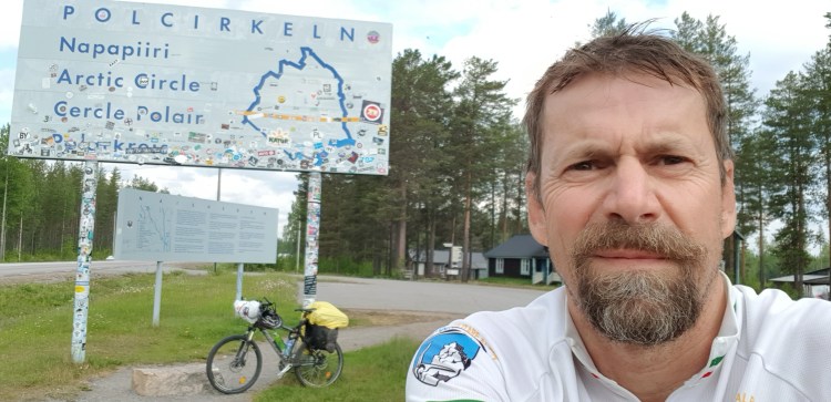 Am Tag 36 erreichte ich den Polarkreis. Inzwischen war die Mücken- und Bremsenplage so schlimm, dass ohne Gesichtsnetz und Mückenschutz eine Weiterfahrt fast unmöglich war. Die Vegetation ähnelte nun schon einer Tundra und die Bäume wurden immer niederer.