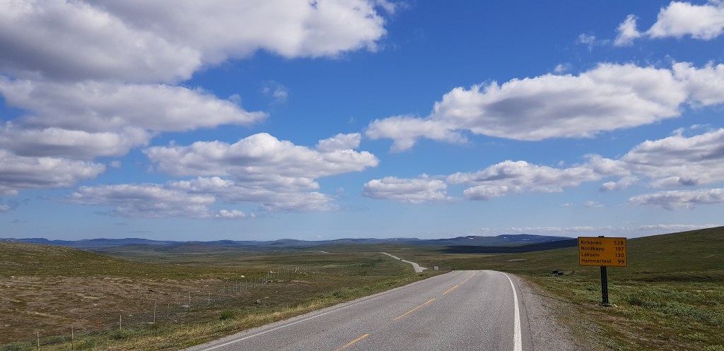 Nach Alta Richtung Nordkap kommt man auf ein Hochplateau mit einer der schönsten Straßen der gesamten Reise, vorausgesetzt man hatte schönes Wetter. Das Hochplateau war auf ungefähr 300 Höhenmeter, hatte aber eine ähnliche Vegetation wie bei uns in den Alpen auf 2000 Meter. Auf dieser Straße sah ich das erste Schild, das zum Nordkap weist, nur noch 197km.